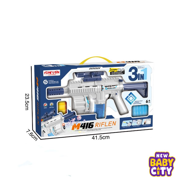 3 in 1 M416 Water Bullet Soft Bullet Bubble Gun is a fun outdoor toy for kids that combines bubble blowing, soft bullet shooting, and water bullet play in one exciting design. It features sound and light effects, making summer playtime more thrilling and interactive.