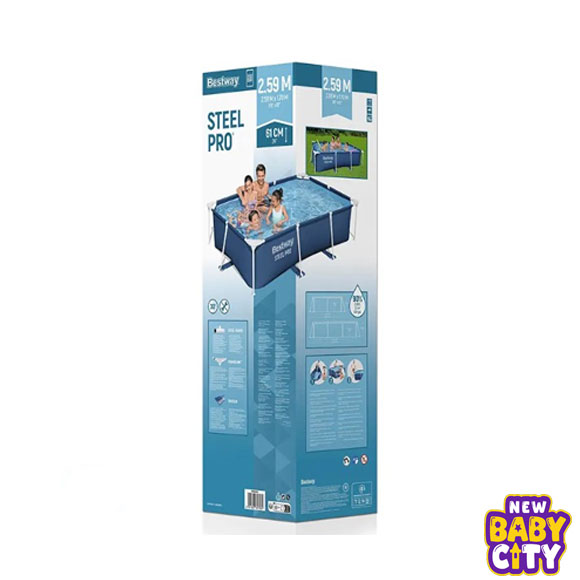 The Bestway Steel Pro Splash Frame Pool – 56403 is a medium-size rectangular above-ground pool designed for family backyard fun. It features a corrosion-resistant steel frame, durable 3-layer TriTech™ PVC walls, and quick tool-free setup—perfect for kids and adults in compact outdoor spaces.