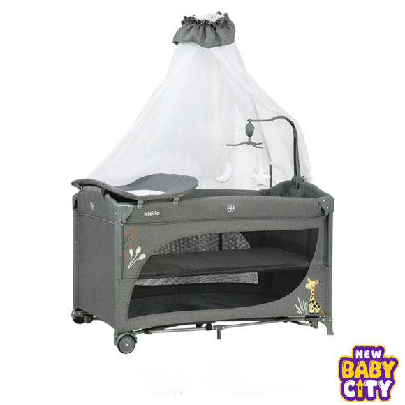 The Kidilo Baby Bed and Playpen T704L is a multifunctional infant bed combining a baby cot, playpen, and changing station in one. Featuring mesh sides for ventilation, two sleeping levels, a built-in rocker, wheels with locks, and musical toys, it offers comfort, safety, and convenience for both sleep and playtime.