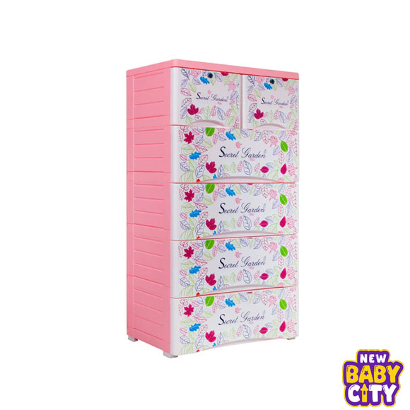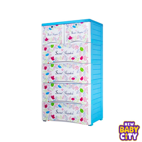 A stylish 4 large + 2 small drawer plastic storage cabinet with an attractive Secret Garden floral print. Made from durable high-strength plastic, it features lockable small drawers, drawer stoppers, and wheels for easy movement — ideal for storing clothes, toys, books, and household essentials.